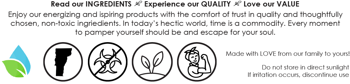 Our bath crystals are handcrafted in small batches in Vermont with plant-based, non-toxic, all-natural ingredients: